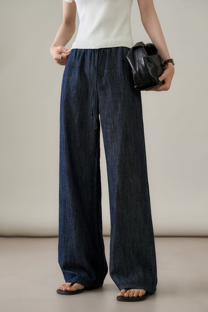 Denim Pull-On Wide-Leg Drawstring Jeans