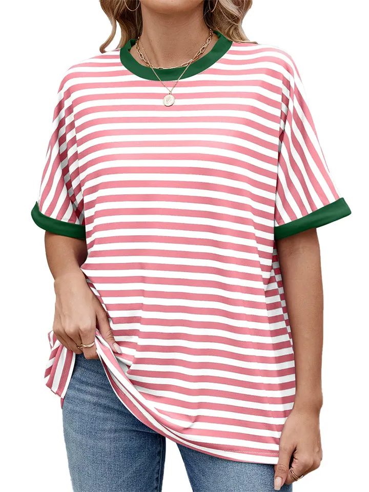 Women's Casual Contrast Color Striped Round Neck Short Sleeve T-Shirts